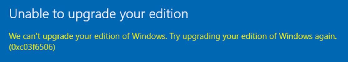 Unable to upgrade your edition, Nosotros tin can't upgrade your edition of Windows. Endeavour upgrading your edition of Windows again. (0xc03f6506).